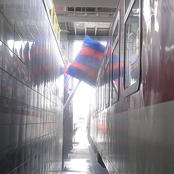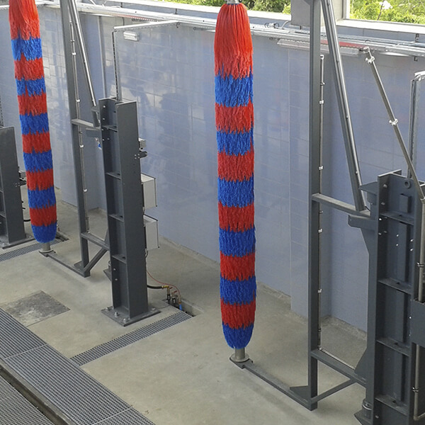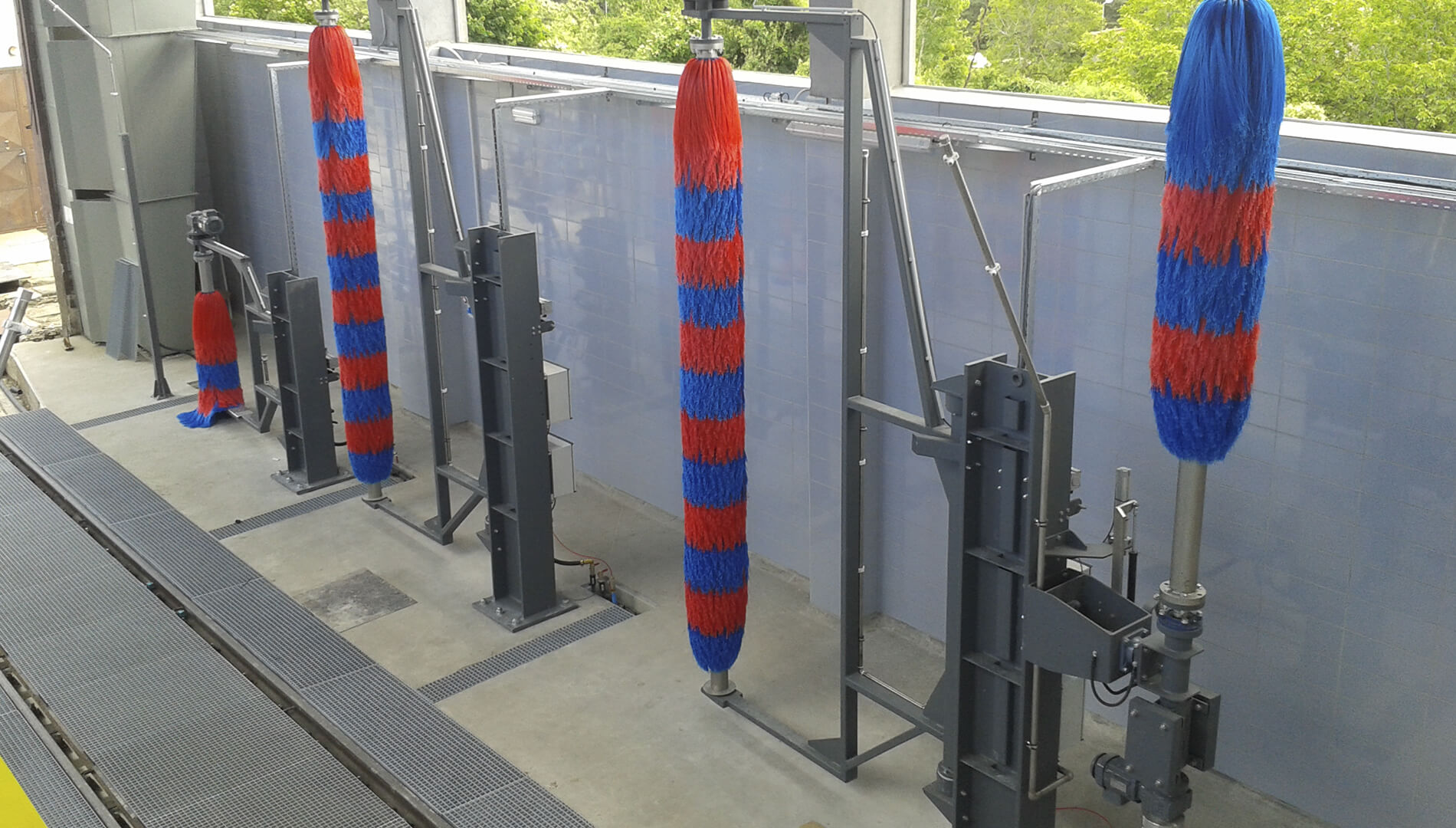 Wäscht die Seiten- ,Schürzen- und Dachrandflächen schnell und gründlich. Die schwenkbar angeordneten und automatisch ausweichenden Bürsten gewährleisten eine schonende Wäsche der Fahrzeugflächen ohne die Gefahr von Beschädigungen. Das Fahrzeug fährt dabei mit eigener Kraft durch die Waschanlage.